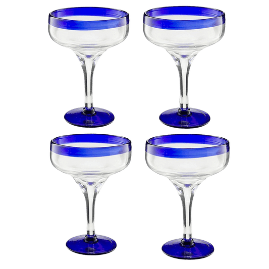Mexican Hand Blown Glass – Set of 4 Large 16oz, Cobalt Blue Rim Line, Luxury Margarita & Cocktail Glasses, Mexico Design Large 16oz Cobalt Cinco de Mayo - The Wine Savant, Dishwasher Safe Glassware
