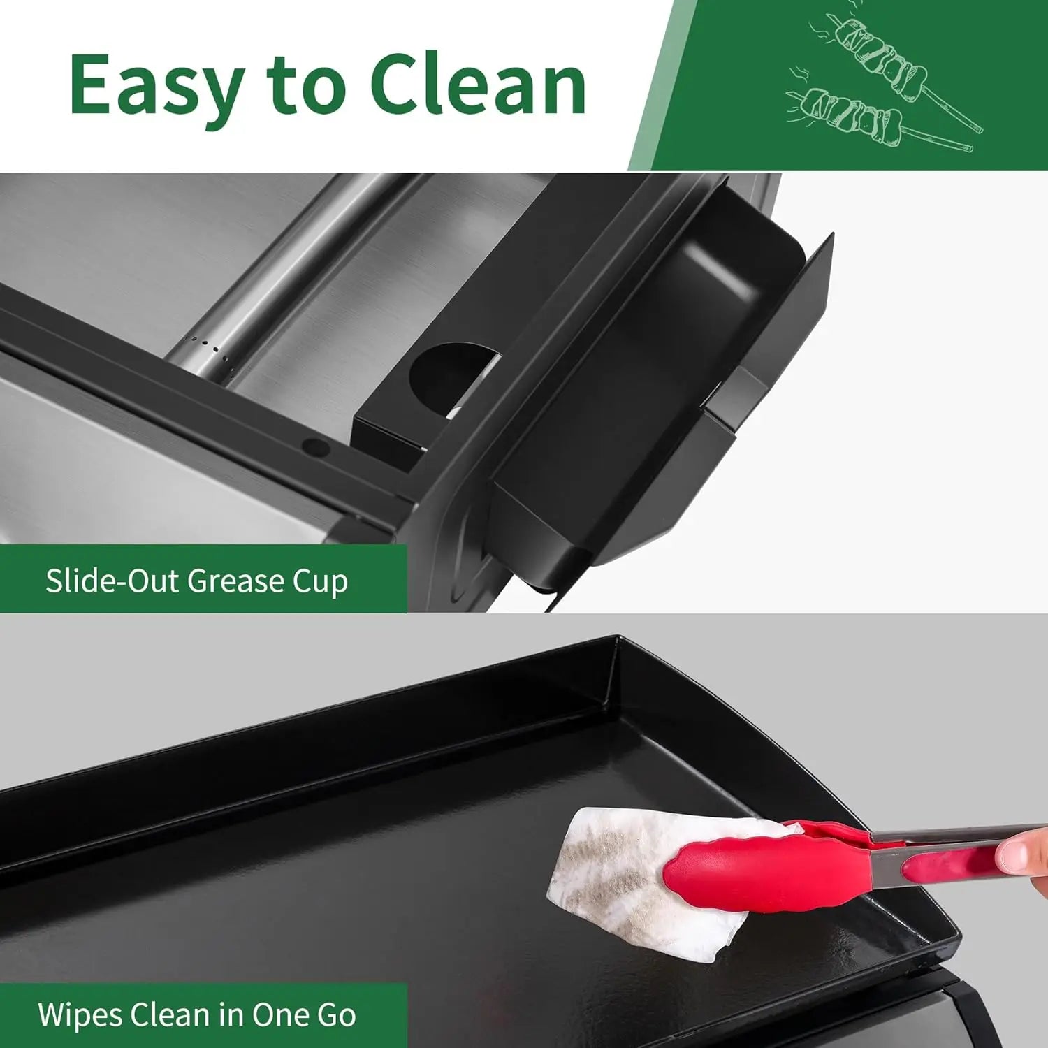 Constructed from corrosion-resistant stainless steel, this grill offers long-lasting resilience against the elements while maintaining a sleek, professional appearance. Its cast iron cooking surface features a ceramic non-stick coating that ensures effortless food release and fast cleanup, making it as convenient as it is durable.