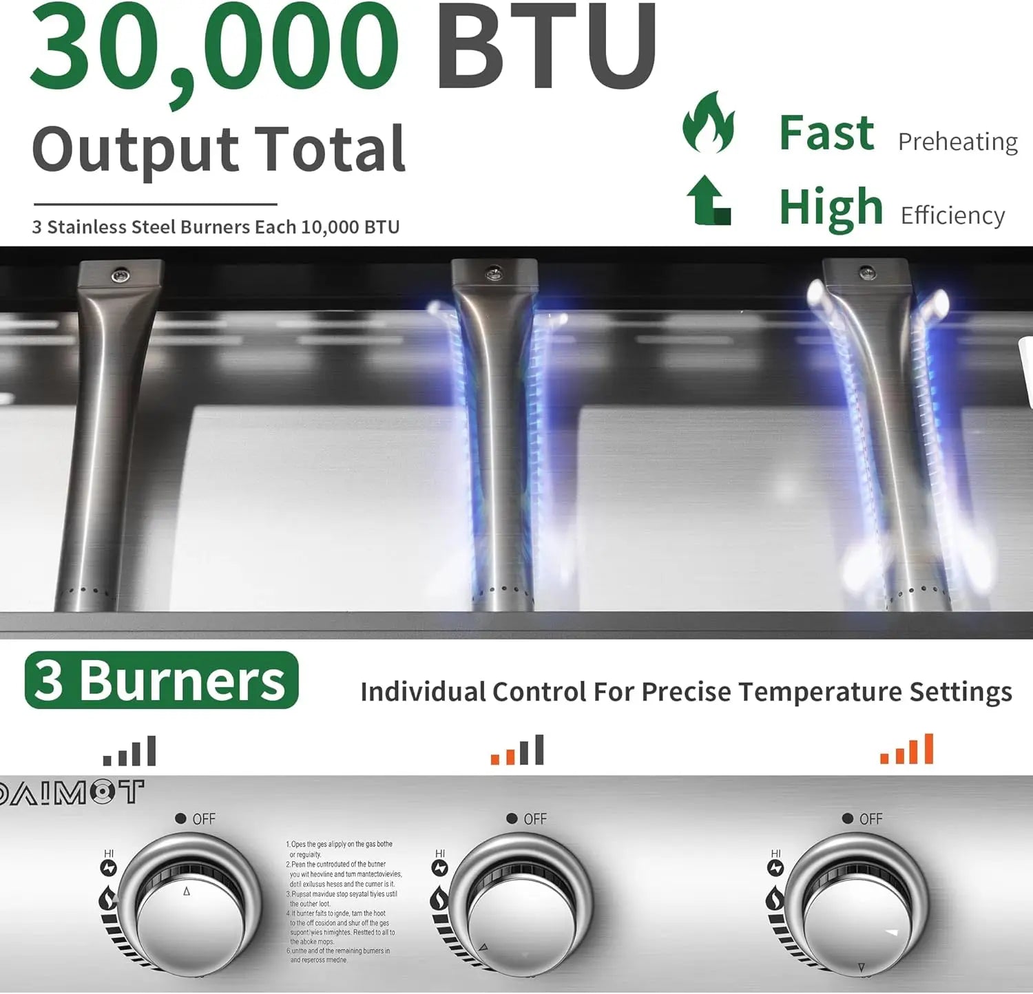 Experience the ultimate in outdoor cooking with this exclusive 24" Gas Griddle Flat Top Grill, designed for those who demand both performance and style. This premium grill stands apart with its powerful three-burner system, delivering a combined 30,000 BTUs of high-output heat, perfect for cooking anything from delicate pancakes to hearty steaks with precision.