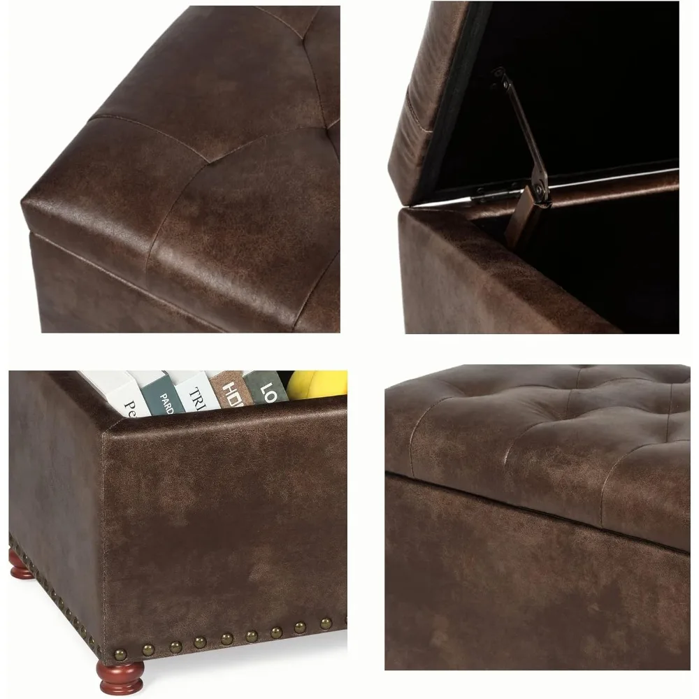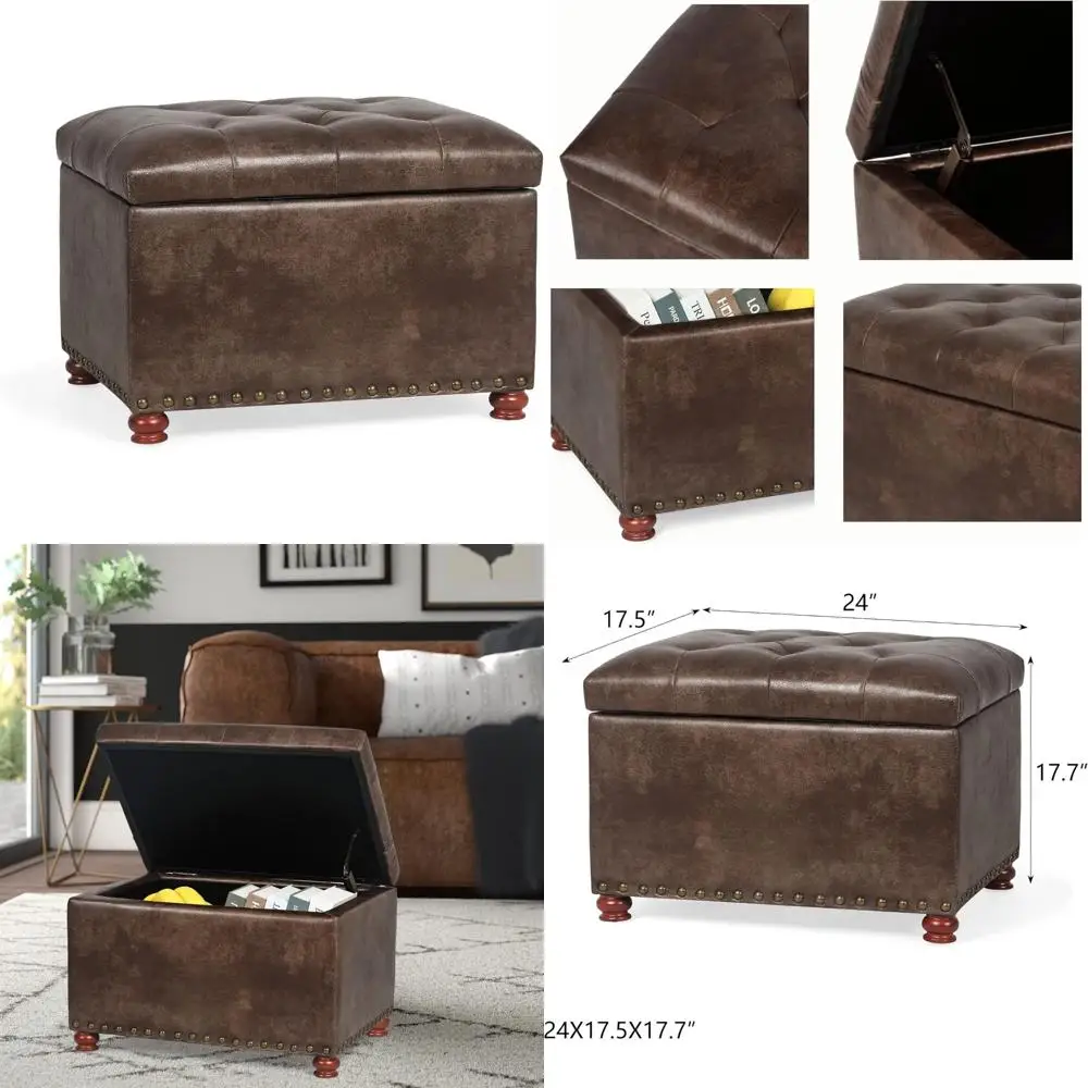 This storage ottoman is a stylish and functional piece of furniture that combines vintage charm with modern convenience. It features a classic reddish-brown wooden base, distinctive rivet accents, and a tufted top, giving it an elegant and luxurious appearance. The ottoman measures 24 inches in length, 17.5 inches in width, and 17.7 inches in height, and weighs approximately 15.27 pounds, making it easy to move around while offering ample storage space for books, toys, pillows, blankets, shoes, and more. Constructed with solid wooden feet and frames, the ottoman is wrapped in a durable Leathaire fabric that closely resembles leather but is actually fabric, ensuring easy cleaning and maintenance. The lid is padded with soft sponge for a comfortable seating experience. Safety is a priority with this ottoman, as it comes equipped with a child safety hinge that prevents the lid from closing suddenly, thus protecting little fingers from getting pinched. Assembly is straightforward, requiring only the attachment of the four feet. Should you encounter any issues during assembly or have any questions, our customer service team is available to assist you within 24 hours, ensuring a hassle-free experience. This storage ottoman is not only a beautiful addition to your home but also a practical solution for keeping your space organized and clutter-free.