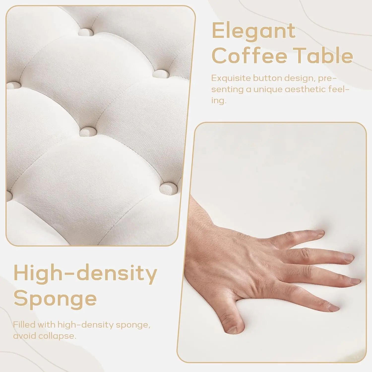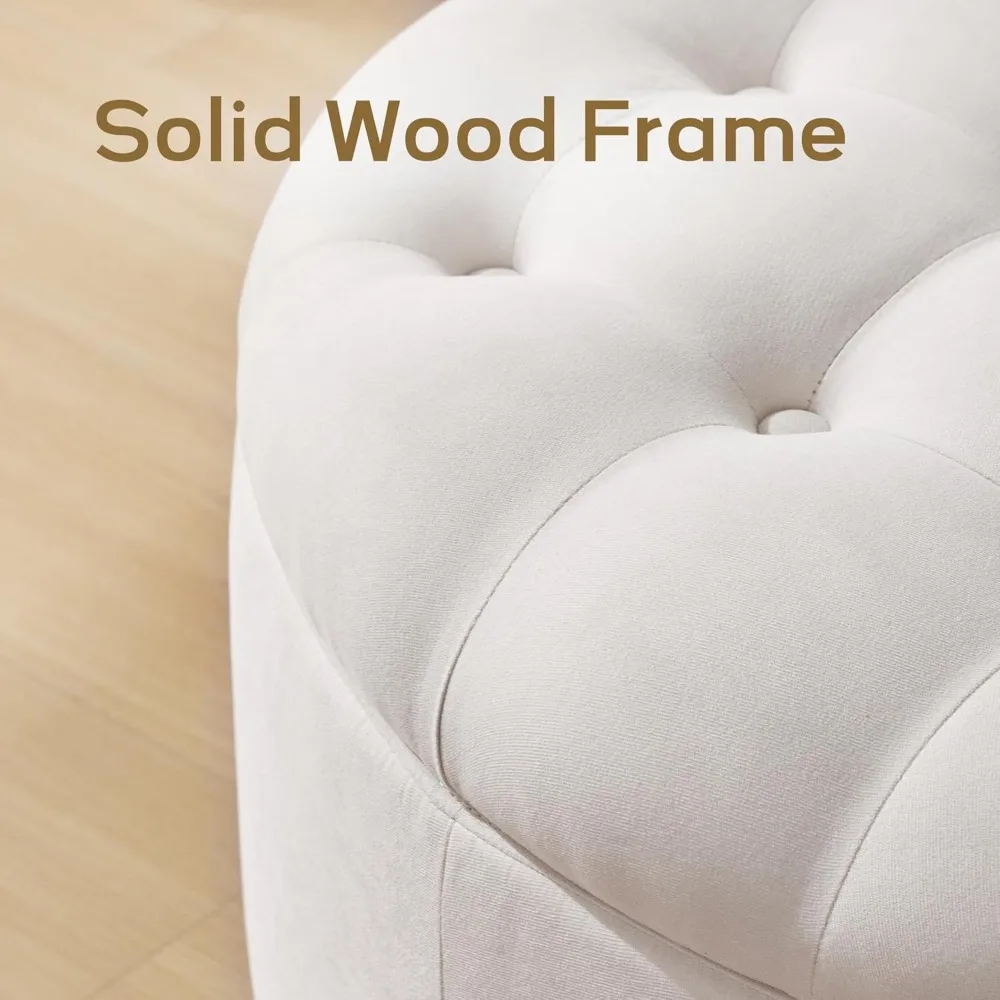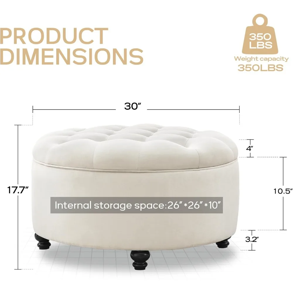 - Elegance Meets Comfort: Our round storage ottoman is a masterpiece of design and comfort. The double collision of soft fabric and button design gives this ottoman coffee table an elegant appearance; Enough high-rebound sponge inside the ottomans remains full and beautiful, with no unsightly impressions left behind, even after you've placed things on it