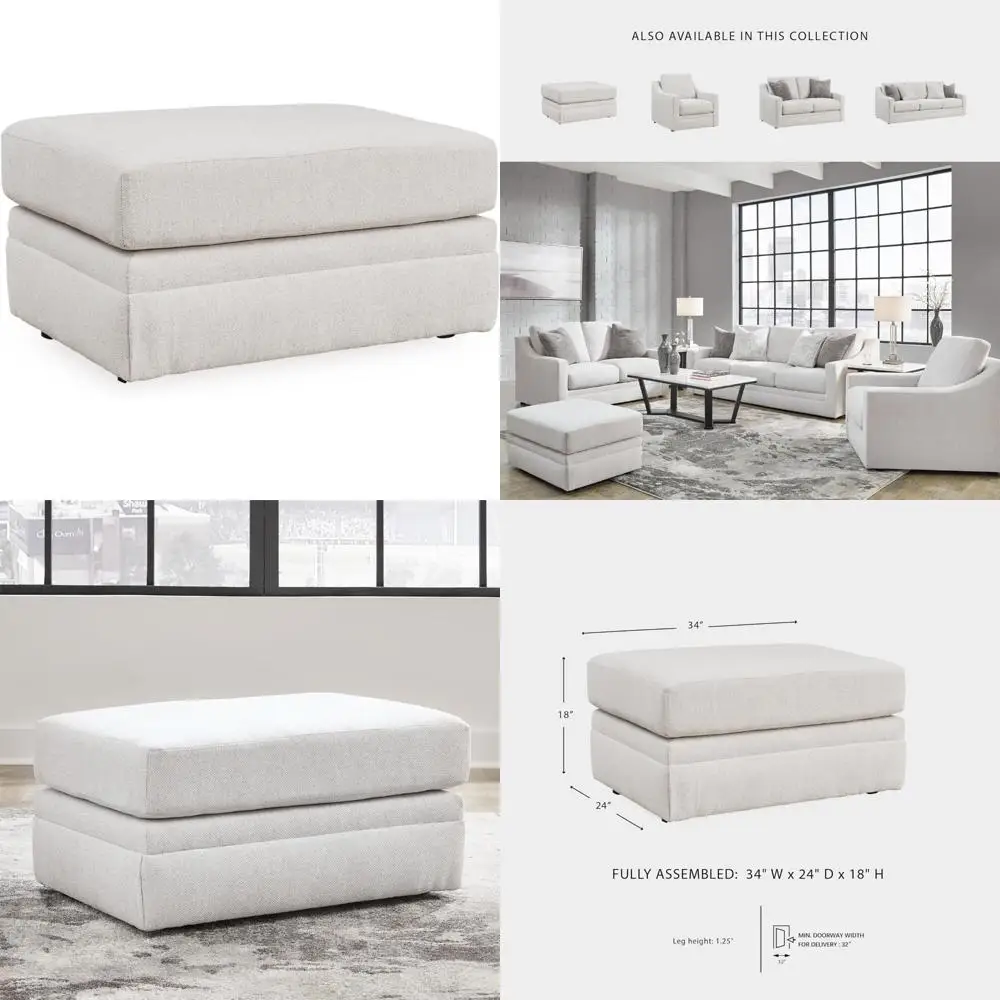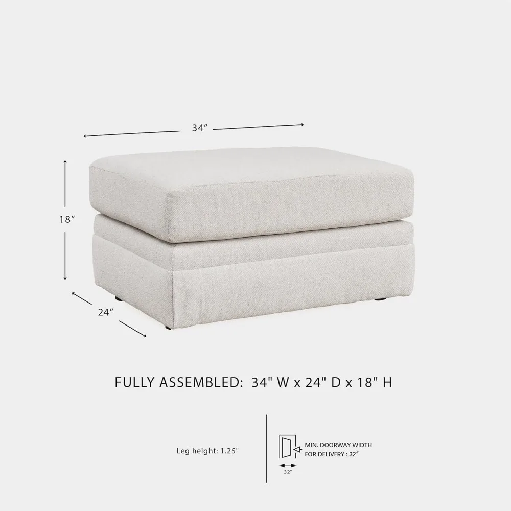 This ottoman is made from 100% polyester, offering a sleek and modern design that can elevate the aesthetic of your lounge area when combined with other seating. It features a streamlined silhouette and clean lines, embodying an architectural style that adds a touch of elegance to any space. The ottoman is meticulously crafted with a sturdy corner-blocked frame and is upholstered in textured polyester, covering a high-quality foam cushion for comfort and durability. It comes with non-skid legs to ensure stability on various surfaces. At Ashley, we offer a diverse range of ottomans, stools, and poufs that can serve as a footrest or a casual coffee table. Our selection includes options from leather to storage ottomans, providing you with versatile choices to suit your needs. Measuring 34 inches in width, 24 inches in depth, and 18 inches in height, with leg height at 1.25 inches, this ottoman is designed to fit through doorways that are 32 inches or wider, making it convenient for placement in your home. Best of all, this ottoman arrives ready to use with no assembly required, allowing you to enjoy its comfort and style immediately upon receipt.
