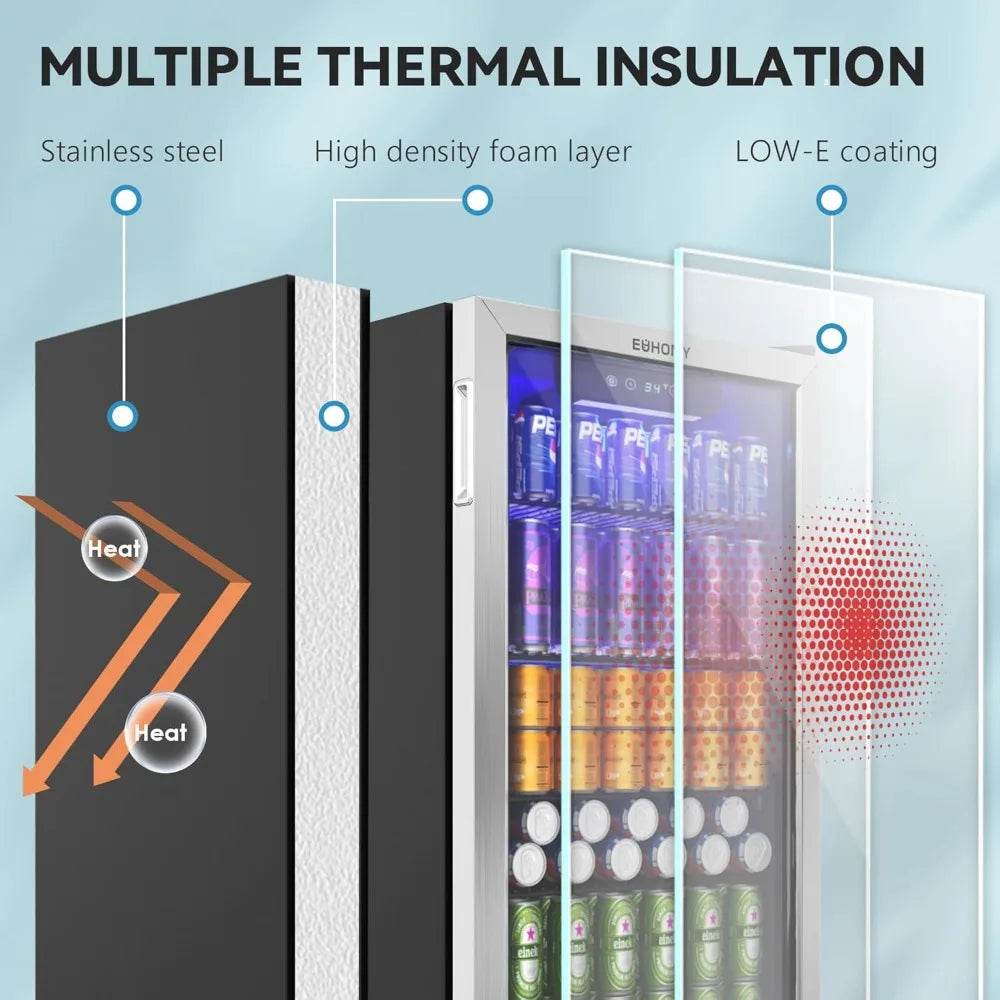 Constructed from premium materials, this mini fridge provides exceptional insulation and durability. The glass door features three layers that offer superior thermal protection, maintaining optimal beverage temperature and freshness.