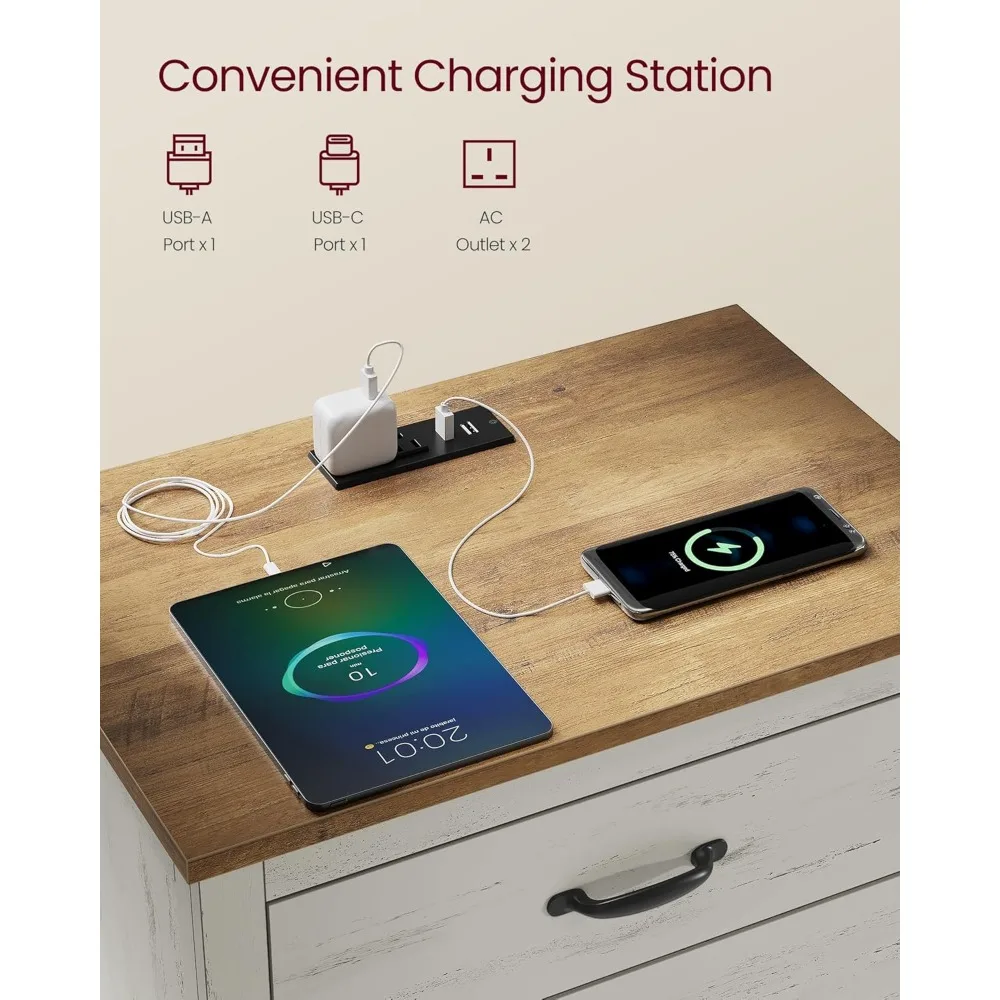 This bedside table, inspired by farmhouse design, features elegant legs, ample storage, and a rustic charm that can enhance any room's aesthetic. With dimensions of 15.7 inches deep by 23.6 inches wide by 24.8 inches high, it provides three spacious drawers for organizing your essentials, whether for nighttime or everyday use. Equipped with a built-in charging station, this nightstand is a practical addition to your bedroom or living space. It includes one USB-A port, one USB-C port, and two AC outlets, ensuring your devices are always charged and ready to go. The design combines sleek lines, warm colors, and rich textures, creating a harmonious blend of modern simplicity and farmhouse style that complements a variety of decors. Durably constructed from high-quality materials, this nightstand can support a maximum load of up to 120 pounds, making it a sturdy choice for your bedside needs. Assembly is a breeze with clearly labeled parts and easy-to-follow instructions, ensuring a stress-free setup process.