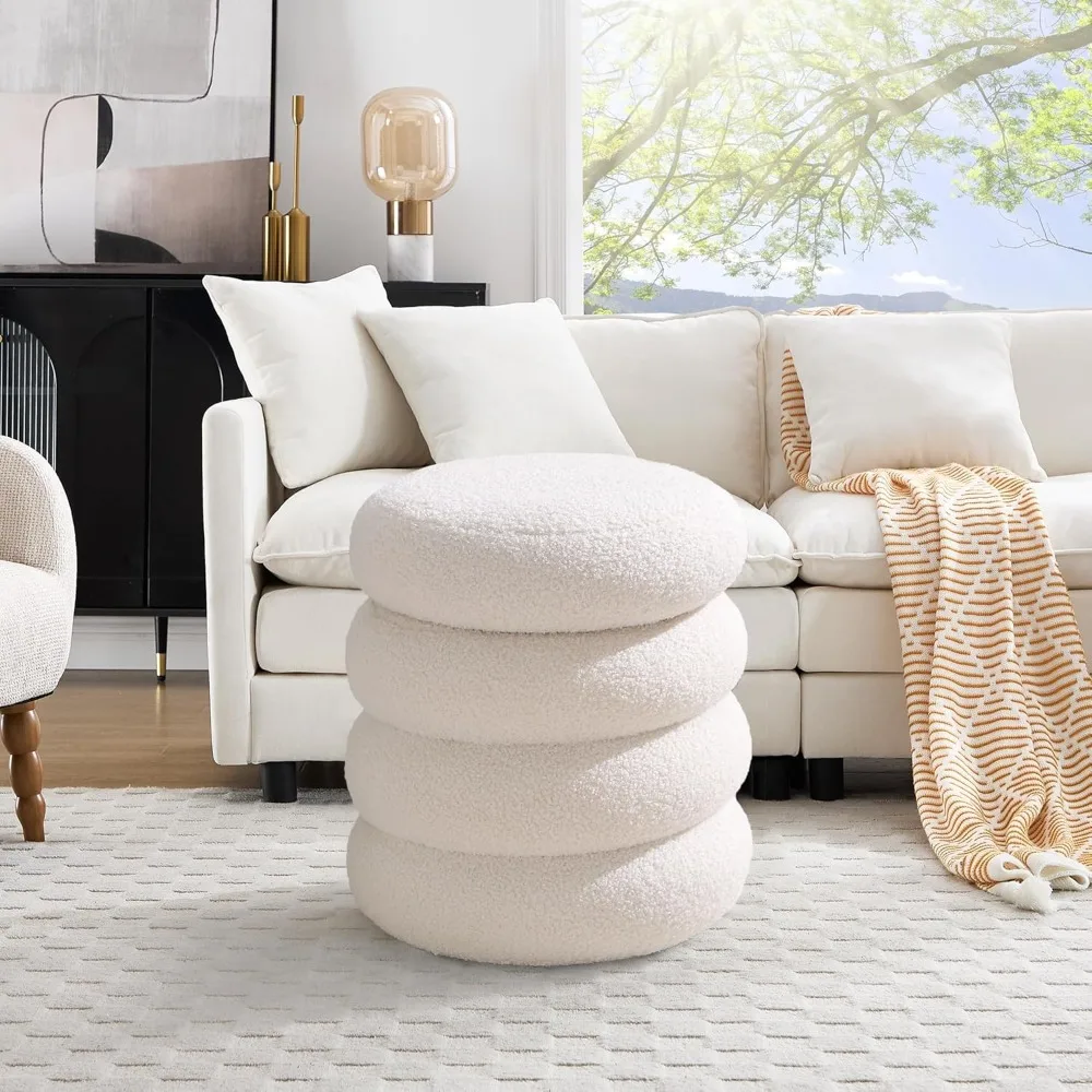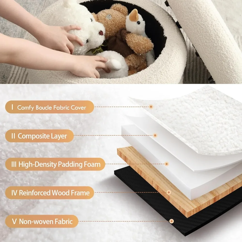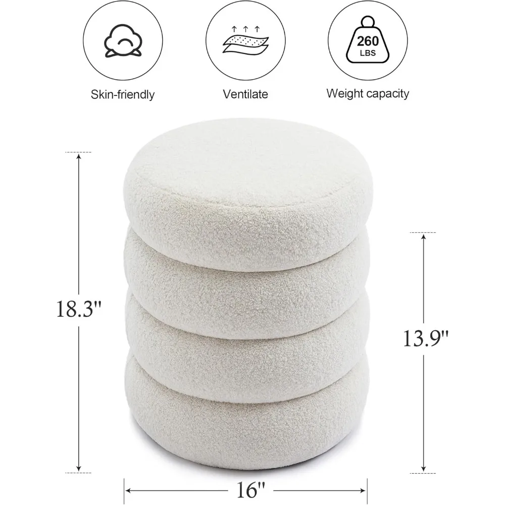 This ottoman features a removable lid that opens up to reveal a storage compartment, ideal for organizing various items such as books, blankets, shoes, remotes, children's toys, and more. It can also serve as a cozy resting spot for pets like cats. Crafted from high-quality teddy fabric, the ottoman boasts a luxurious appearance and a soft feel, filled with high-density foam and supported by a sturdy wooden board for comfort and durability. Its versatility makes it suitable as a footstool, additional seating, or even a coffee table in various settings such as dinner parties and gatherings. It can also function as a sleeper sofa, extra seating, bedroom storage, or a unique side table. With a round and compact design measuring 16 inches in width and depth and 18.3 inches in height, this ottoman fits well in any decorative space and can be easily placed next to desks or vanities. It comes fully assembled, ready for immediate use, and includes invisible rubber feet that protect your floors and prevent slipping, with a weight limit of 260lbs.