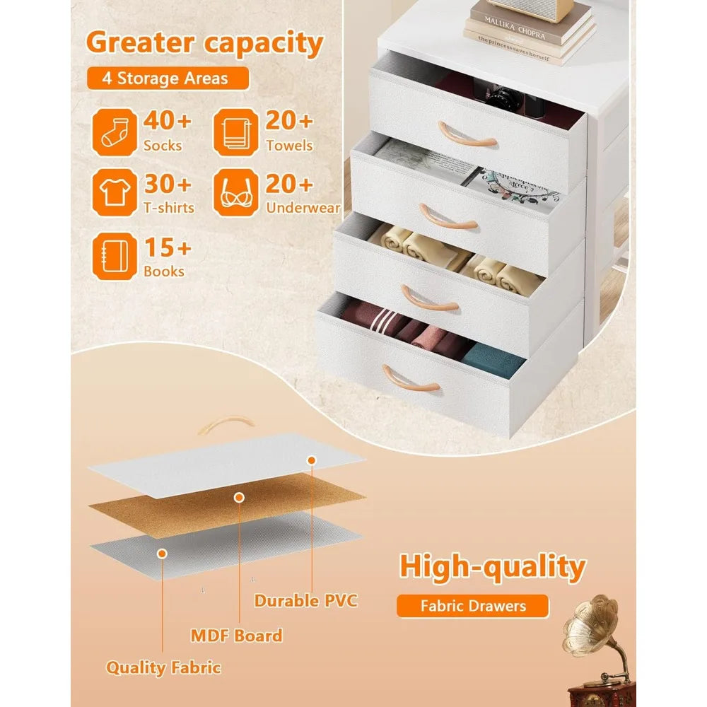 - 【Tall Nightstand with Storage Shelves】The 4 fabric drawers provide ample storage space for your personal items organized, allowing you to keep your essentials organized. In addition, 2 tiers of wood shelving provide additional open storage space to keep items neatly organized and within reach.
