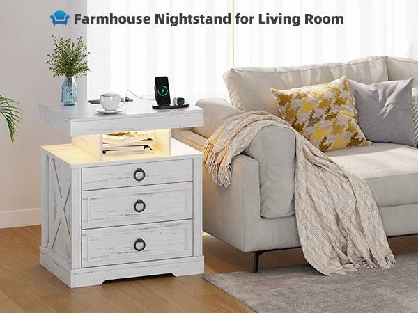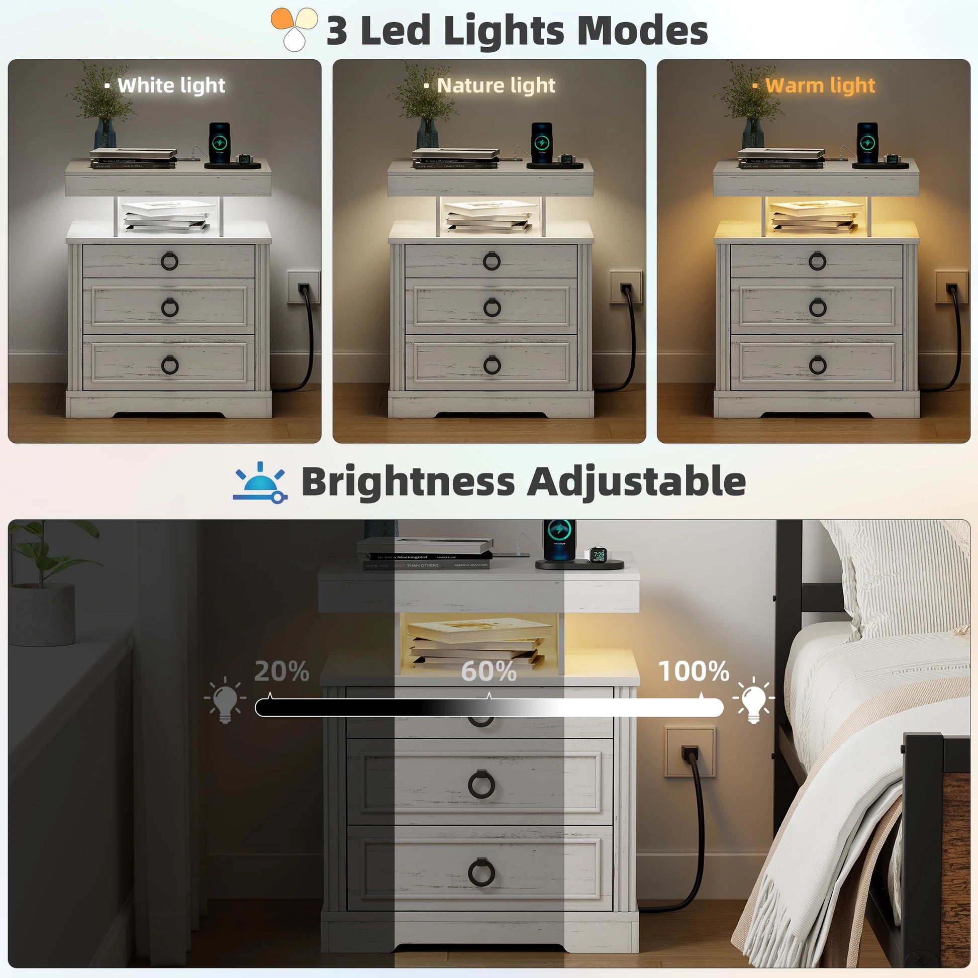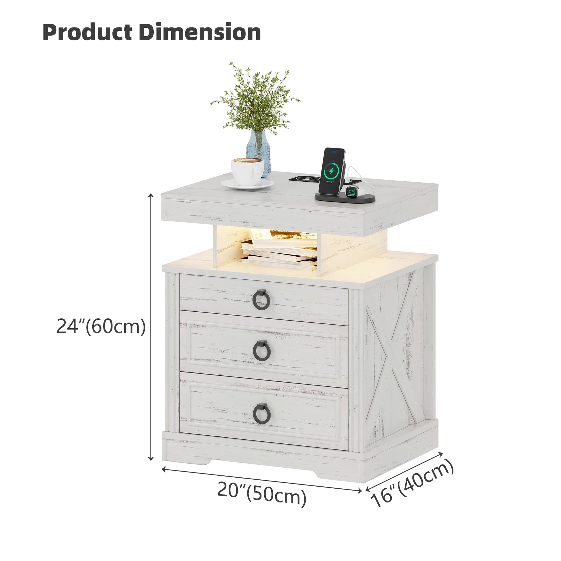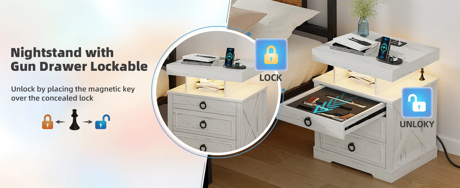 JDPAG Farmhouse Nightstand with Lockable Gun Drawer,3 Color Dimmable LED End Table with Charging Station,Bedside Table with Huma