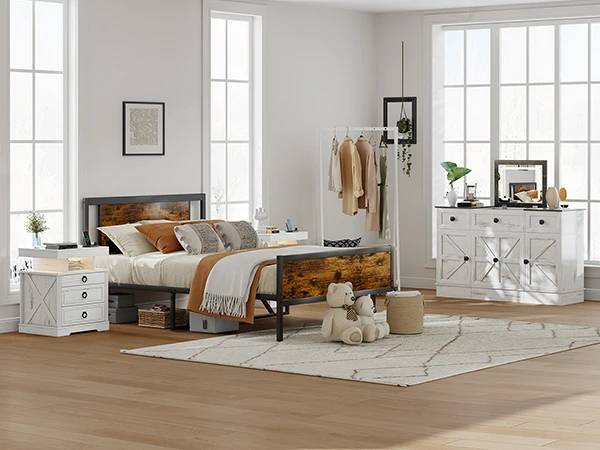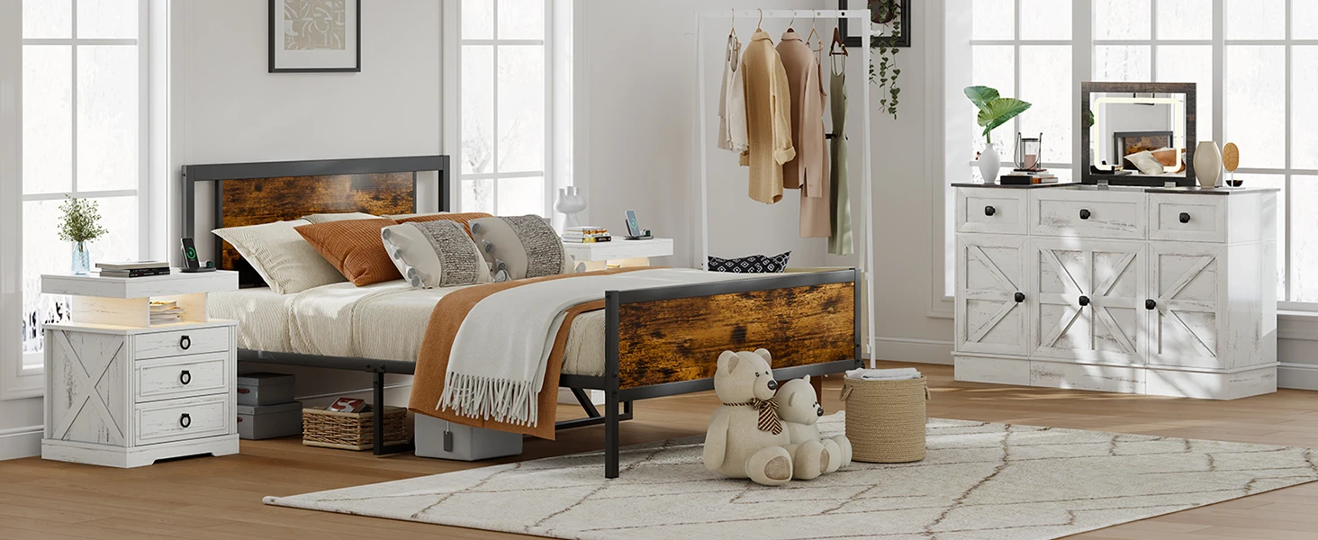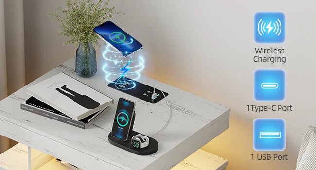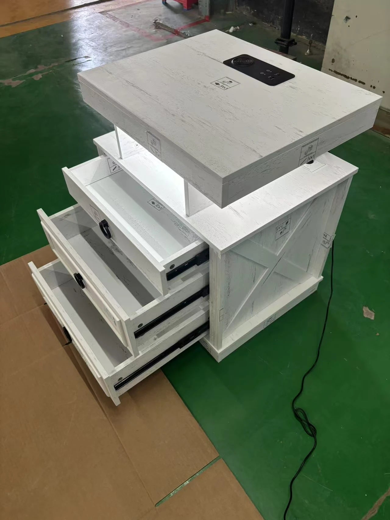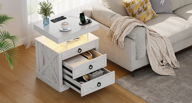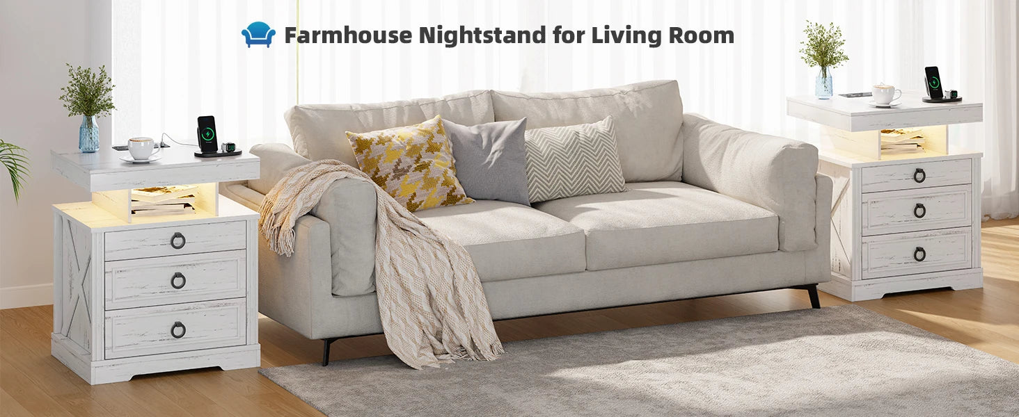 JDPAG Farmhouse Nightstand with Lockable Gun Drawer,3 Color Dimmable LED End Table with Charging Station,Bedside Table with Huma