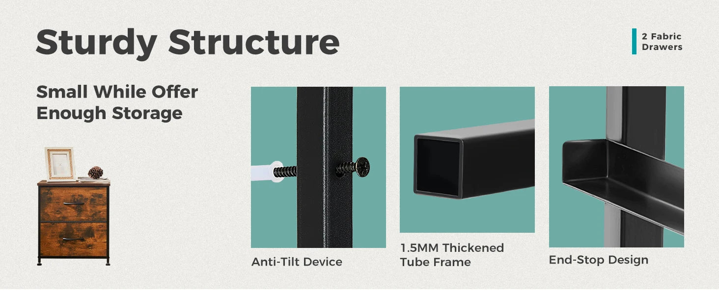 【Studry & Durable】The side tables is equipped with 1.5mm thickened steel frame, 15mm MDF board and waterproof wooden board for a long-lasting structure that is not easily deformed. 4 adjustable plastic feet protect floors from scratches. Easy-pull drawers glide and close smoothly.