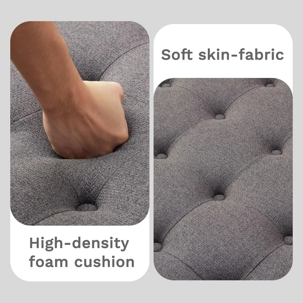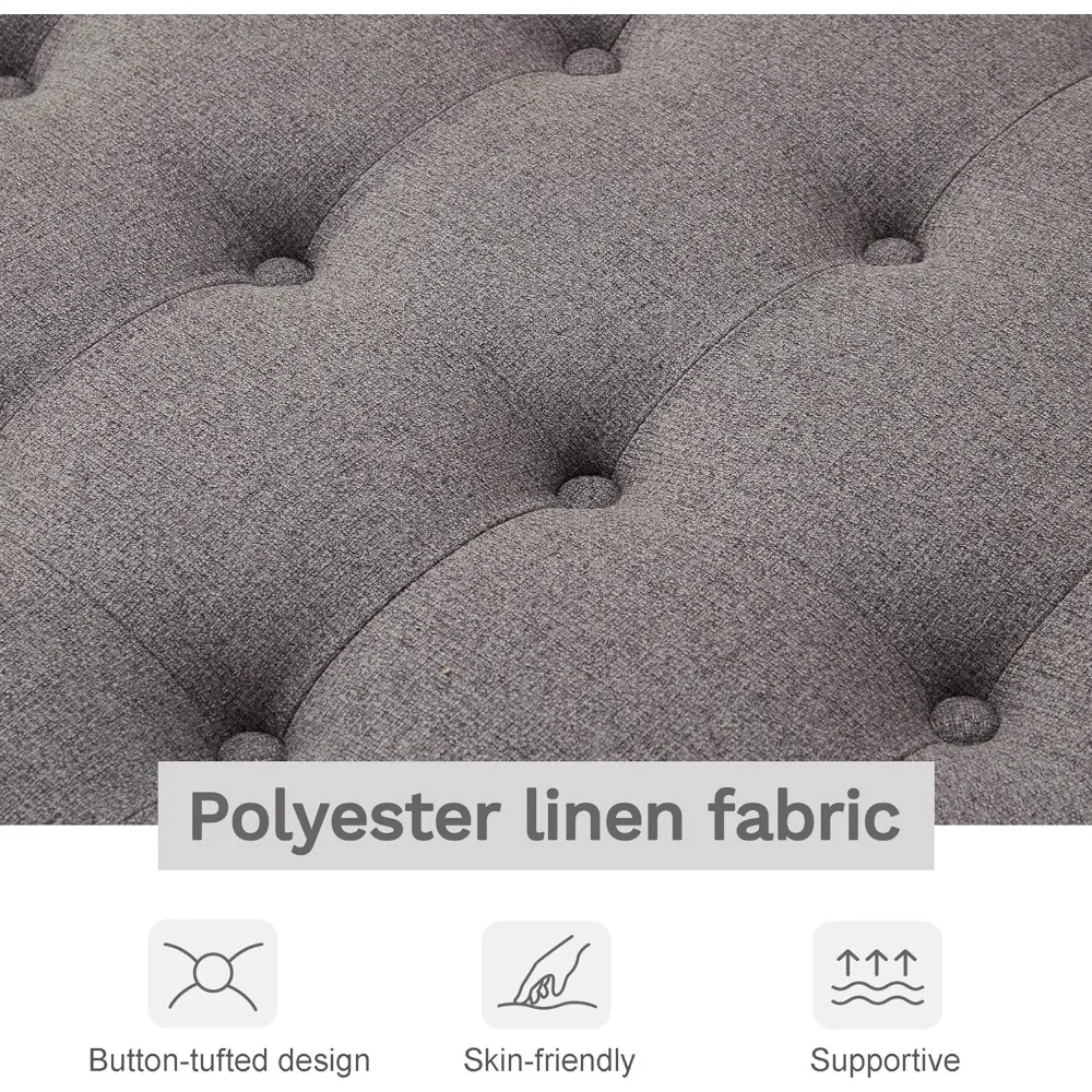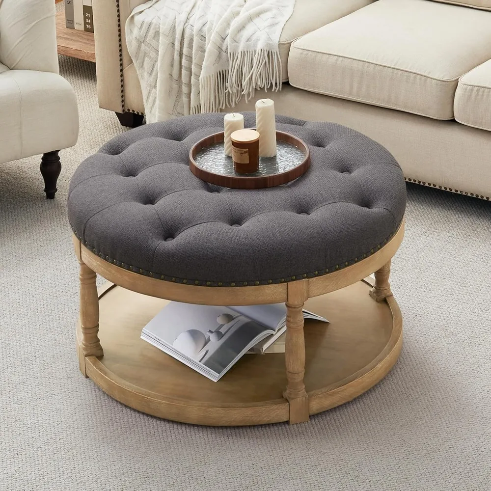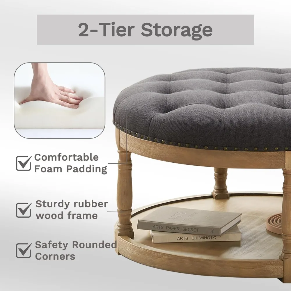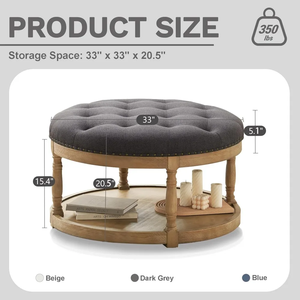This 33-inch round ottoman is a versatile piece of furniture that can be used as a coffee table, footrest, or side table. It features chic button-tufted linen upholstery that matches any home decor, and an open wood storage shelf that provides practical space for storing magazines, books, or blankets. Built with durable rubber wood legs and a retro rivets brushed finish, this ottoman can support up to 350 lbs and its stylish design complements various interior styles, including modern, farmhouse, and mid-century vintage. The button-tufted cushion offers exceptional comfort, making it ideal for resting your feet or as additional seating. With dimensions of 33 inches wide, 33 inches deep, and 20.5 inches high, it's perfect for relaxation and social gatherings. The ottoman also features a 2-tier storage space, helping you keep your living space organized and clutter-free while enhancing your decor. It's easy to assemble, with all accessories and instructions included, allowing you to set up this stylish ottoman in just 15 minutes, making it perfect for those who appreciate both aesthetics and convenience.
