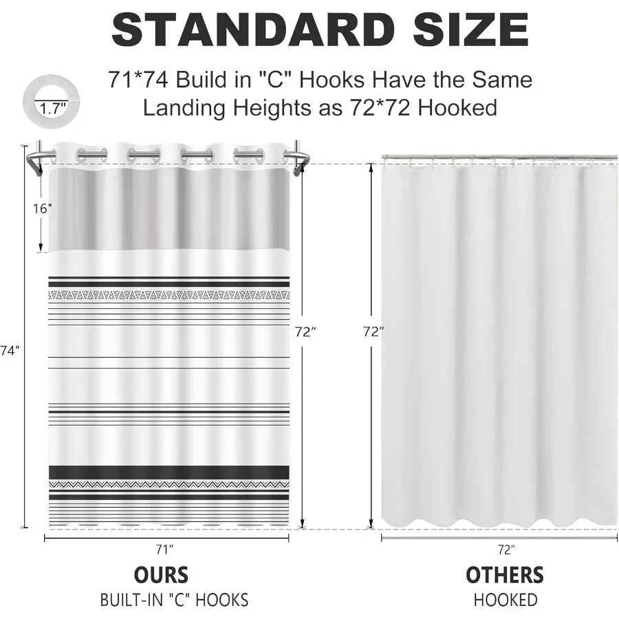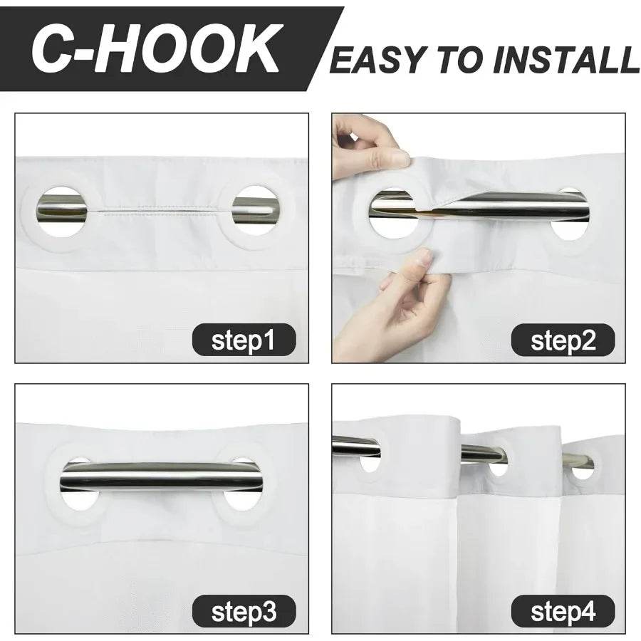 No Hook Shower Curtain: There is a thin gap between each built-in ring, allowing you to attach the shower curtain to the shower rod without removing the end of the shower rod